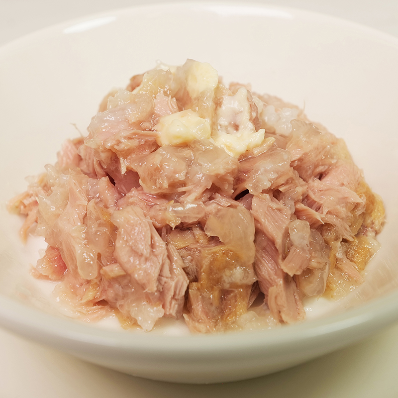 マグロとチーズでタンパク質、オメガ3脂肪酸、カルシウムを補給し、消化しやすい少量の米を配合したフレークタイプのレシピです。