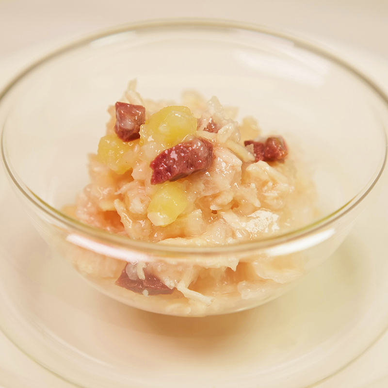 鶏肉、ゲル化溶液、ラムの心臓、じゃがいも、米